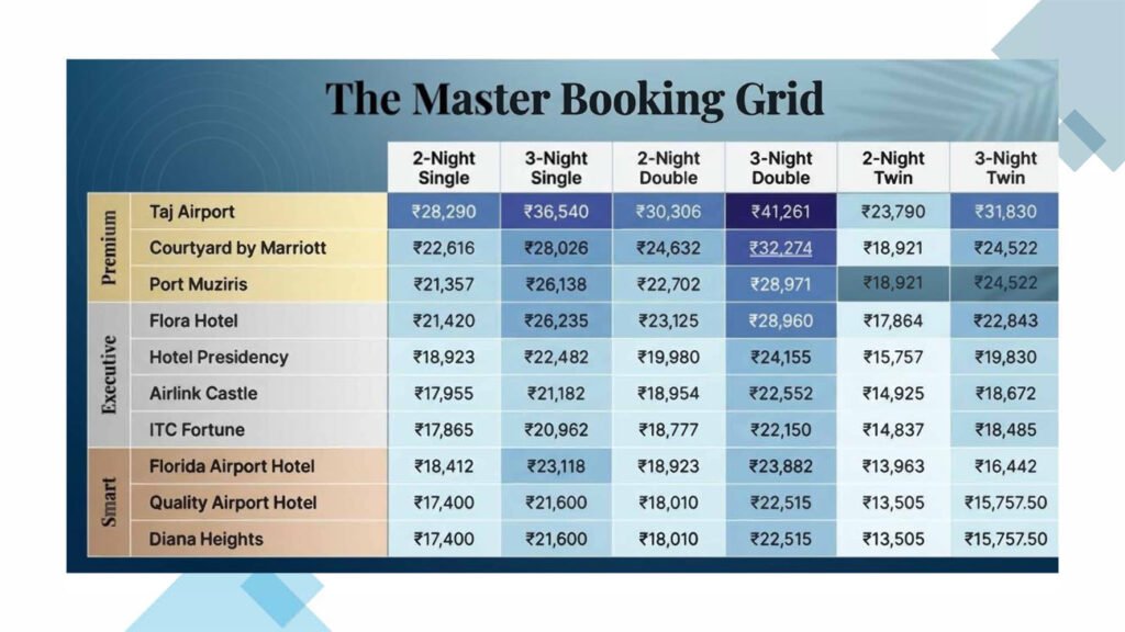 | Port Muziris | 5★ | 1 KM | 30 | 13,220 | Single | 39,660 | 26,440 | 9,000 | 48,662 | 35,443 |