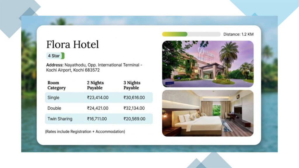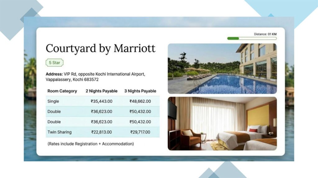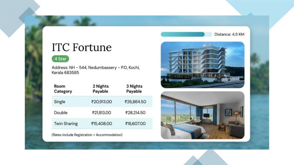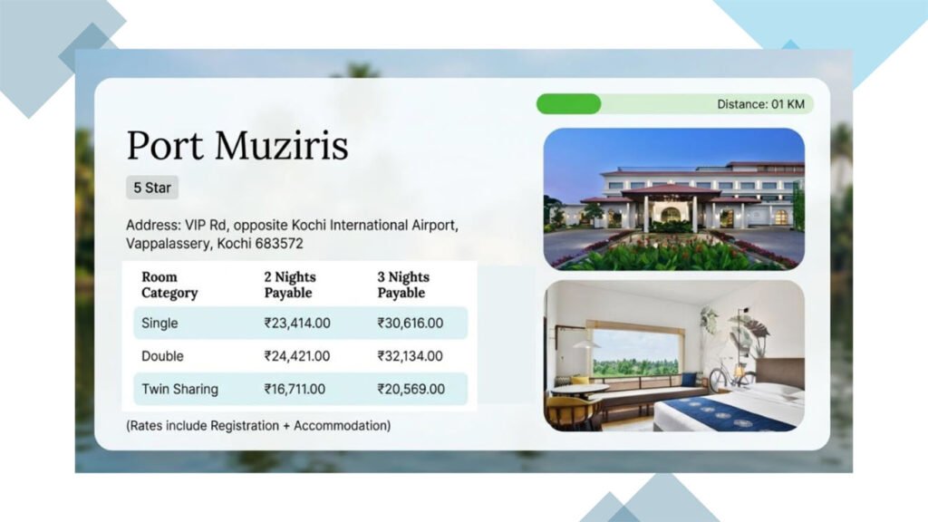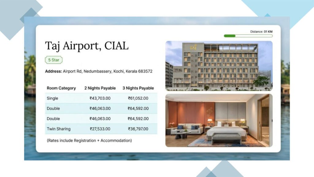 - Located within 5 – 10 minutes’ drive to both conference venue and Cochin International Airport (CIAL)